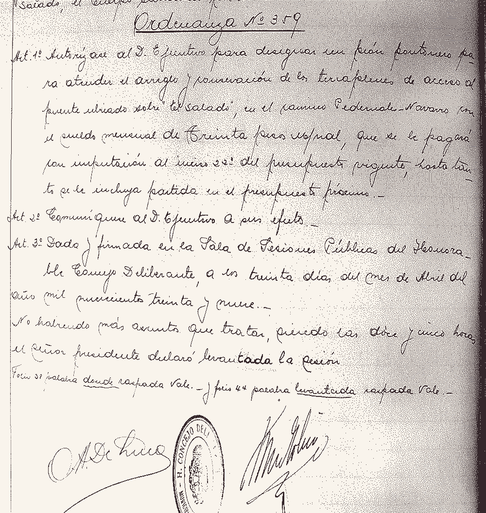 Folio 44 – Ordenanza 359 – Autoriza al Departamento Ejecutivo para designar un peón pontonero para atender el arreglo y conservación de los terraplenes de acceso al puente ubicado sobre “El Salado”, en el camino Pedernales- Navarro. |