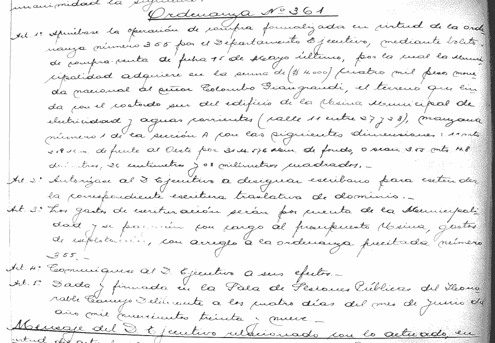 Folio 46 - Ordenanza N° 361 – Demuestra que lo anterior no es de importancia para el cuerpo. Aprueba la operación de compra del terreno que linda con el costado Sur del edificio de la Usina Municipal de Electricidad y Aguas Corrientes. |